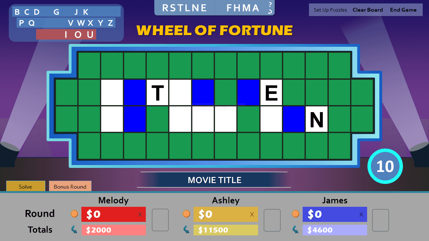 As you probably already know, the bonus round in Wheel of Fortune is when the winning contestant tries to solve one more puzzle with a limited amount of letters for a chance at a big prize. My PowerPoint implementation attempts to streamline this process. Access the bonus round by cycling through the round tabs.