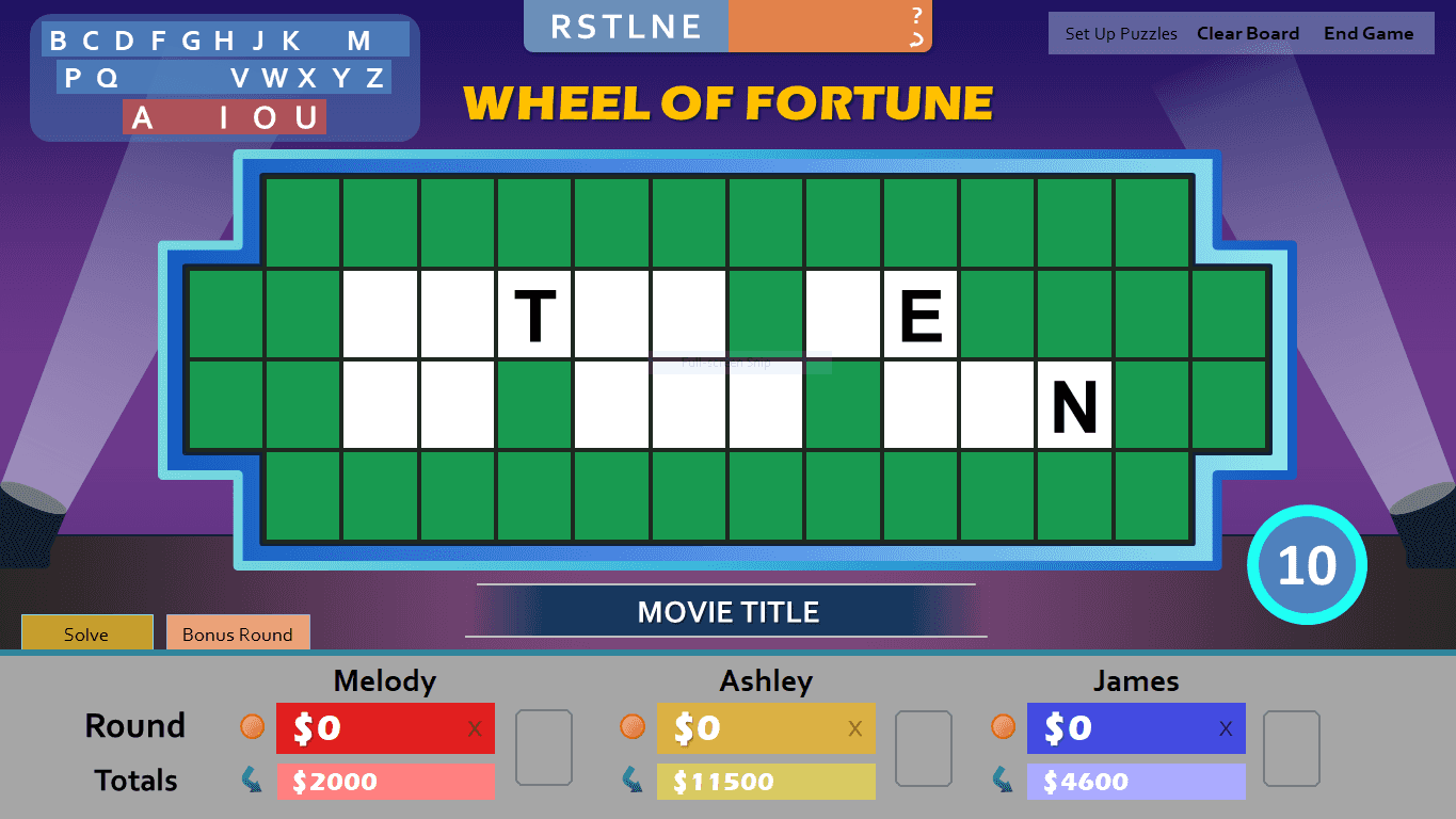 Once all the letters are up, the contestant has ten seconds to guess the puzzle. Click the timer on the bottom right to start the countdown.